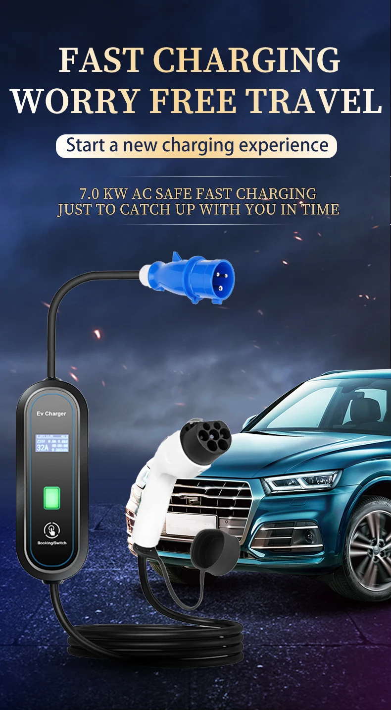 Teschev Level 2 EV Charger GBT Standard 10A/16A/20A/24A/32A 1P 7KW Wallbox Cable 5m For Electric Vehicle China Cars